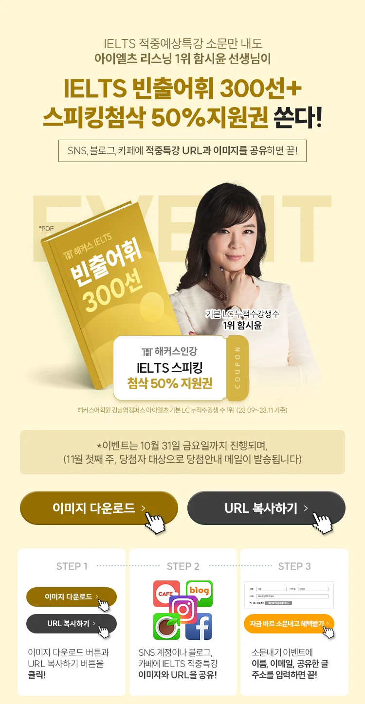 1) 고우해커스 아이엘츠 적중특강 영상 소문내기 이벤트 신청에 따른 본인 확인, 혜택 발송, 안내 및 관련 문의 사항 응대